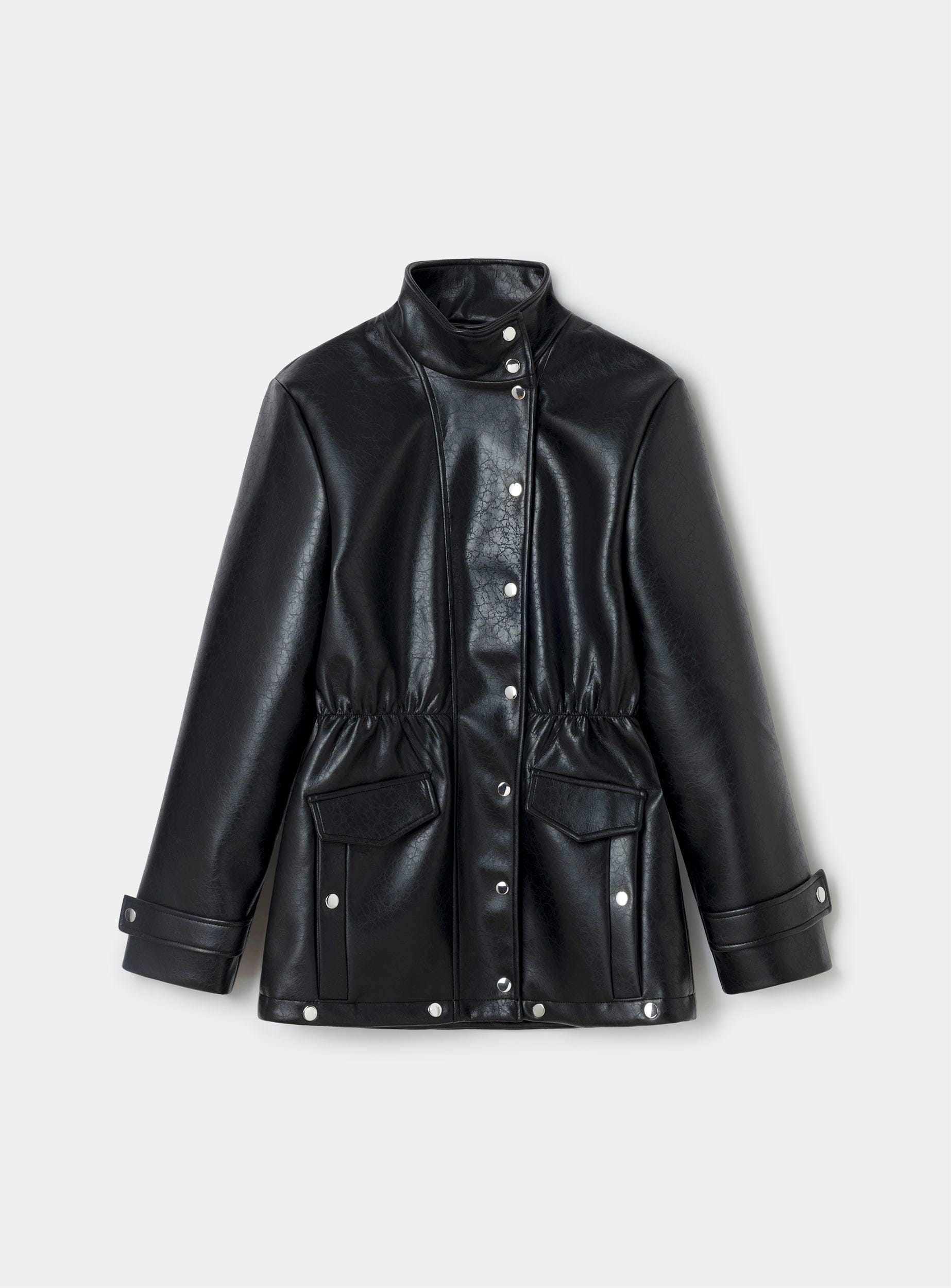 Black faux leather jacket featuring high stand-up crossed collar secured with a two metallic snap-button closure. Front placket with metallic snaps closure. Cinched gathered waist with inner rubber. Lateral pockets. Back with seams and stitchings and a loop with metallic imagotype. Ranglan sleeves with adjustable cuff tabs. Black lining.
