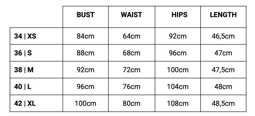 | EU SIZE | XXS | XS | S | M | L | XL |