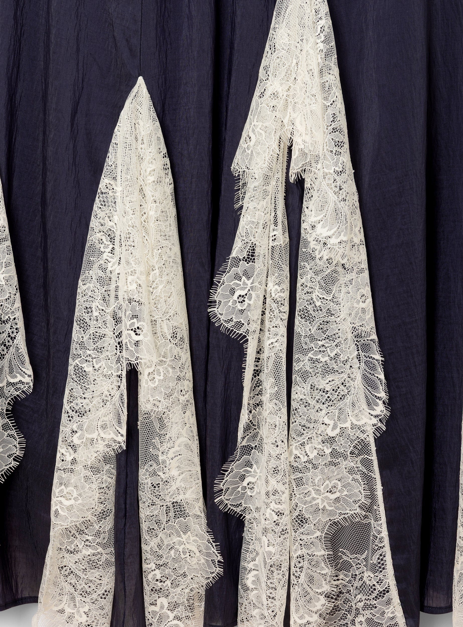 Long flared skirt with front and back slit inserts finished with contrasting lace ruffles. Side invisible zip closure. Fully lined in black.