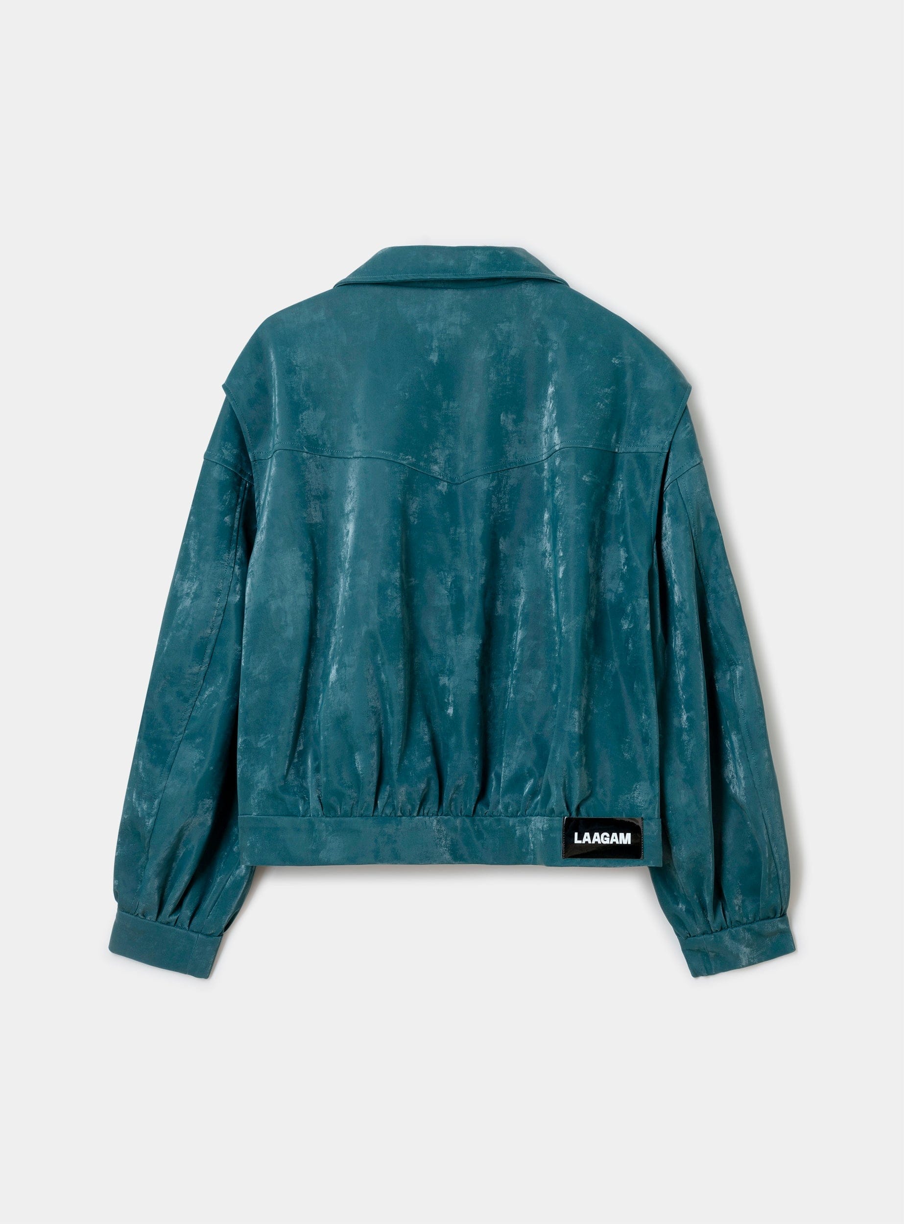 Textured bomber jacket featuring a lapel collar and puffed long sleeves. Front and back yokes with stitchings. Side pockets. Long wide sleeves gathered in cuff pieces. Black Lining. Front metal zipper fastening with sides on tone.