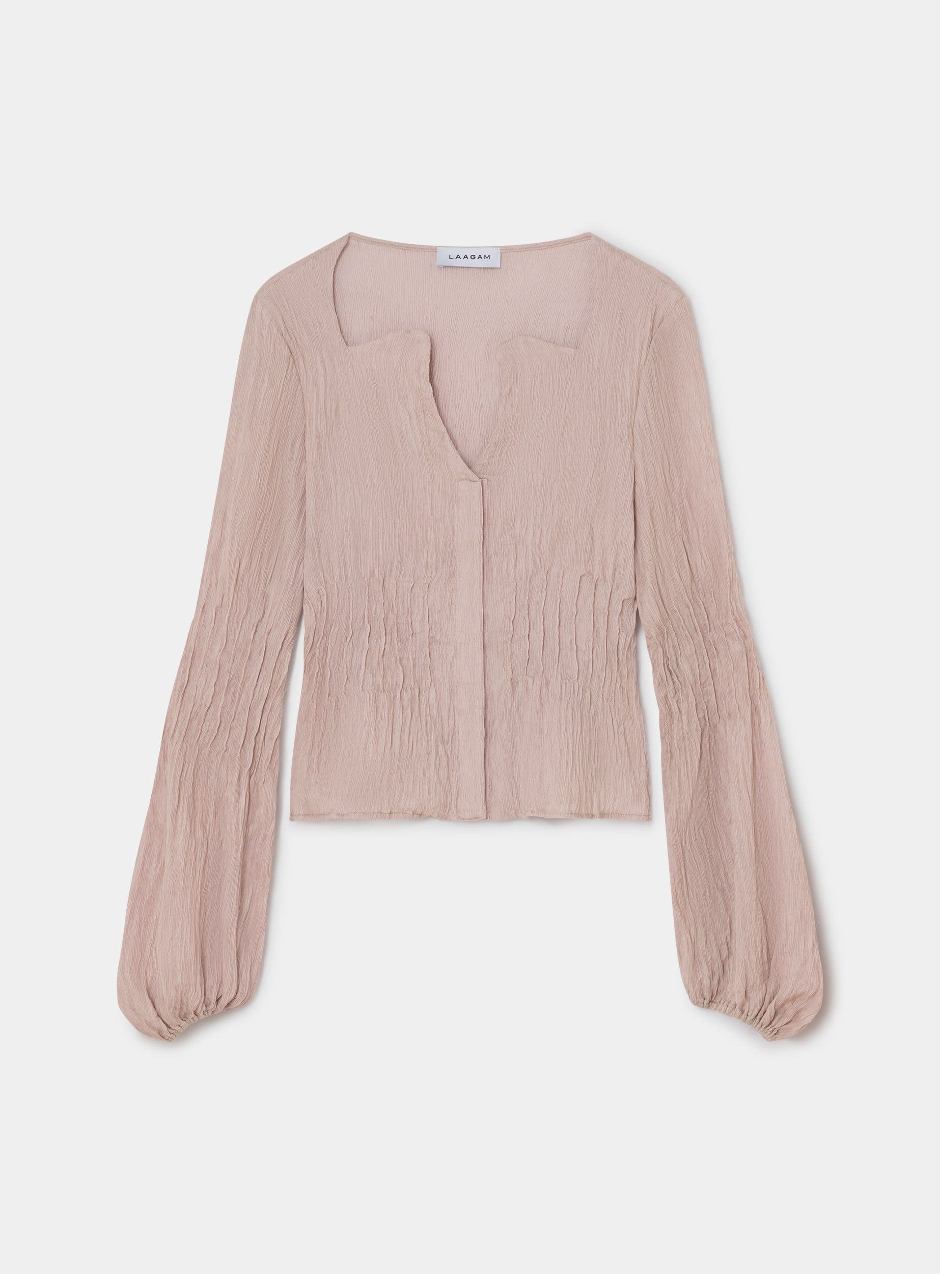 Long-sleeve textured blouse featuring a V-neckline with shaped flaps and front trim closures. Fitted silhouette with flared bottom. Puff sleeves with voluminous cuffs.