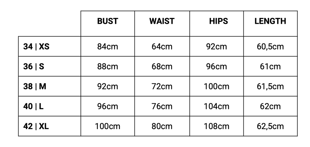 | EU SIZE | XXS | XS | S | M | L | XL |
