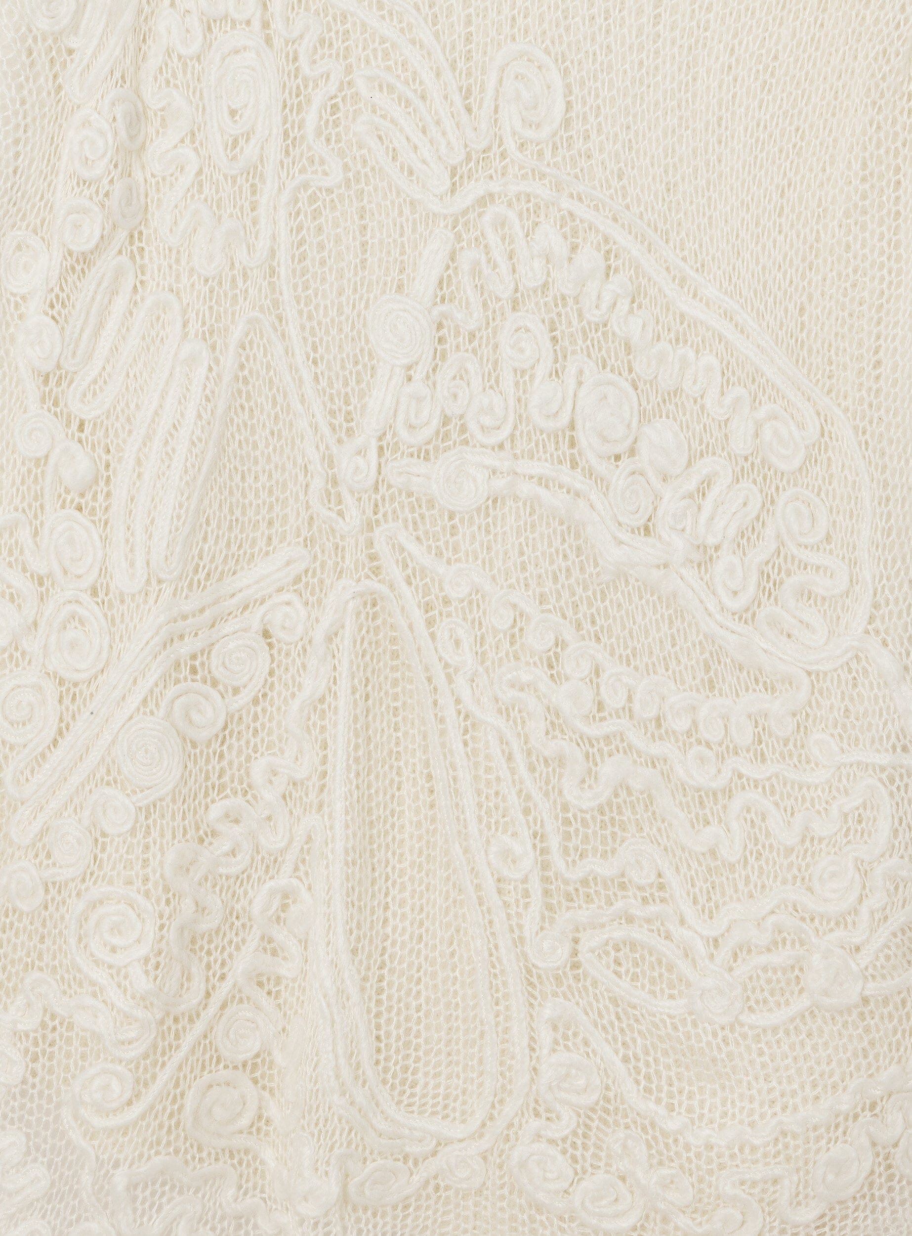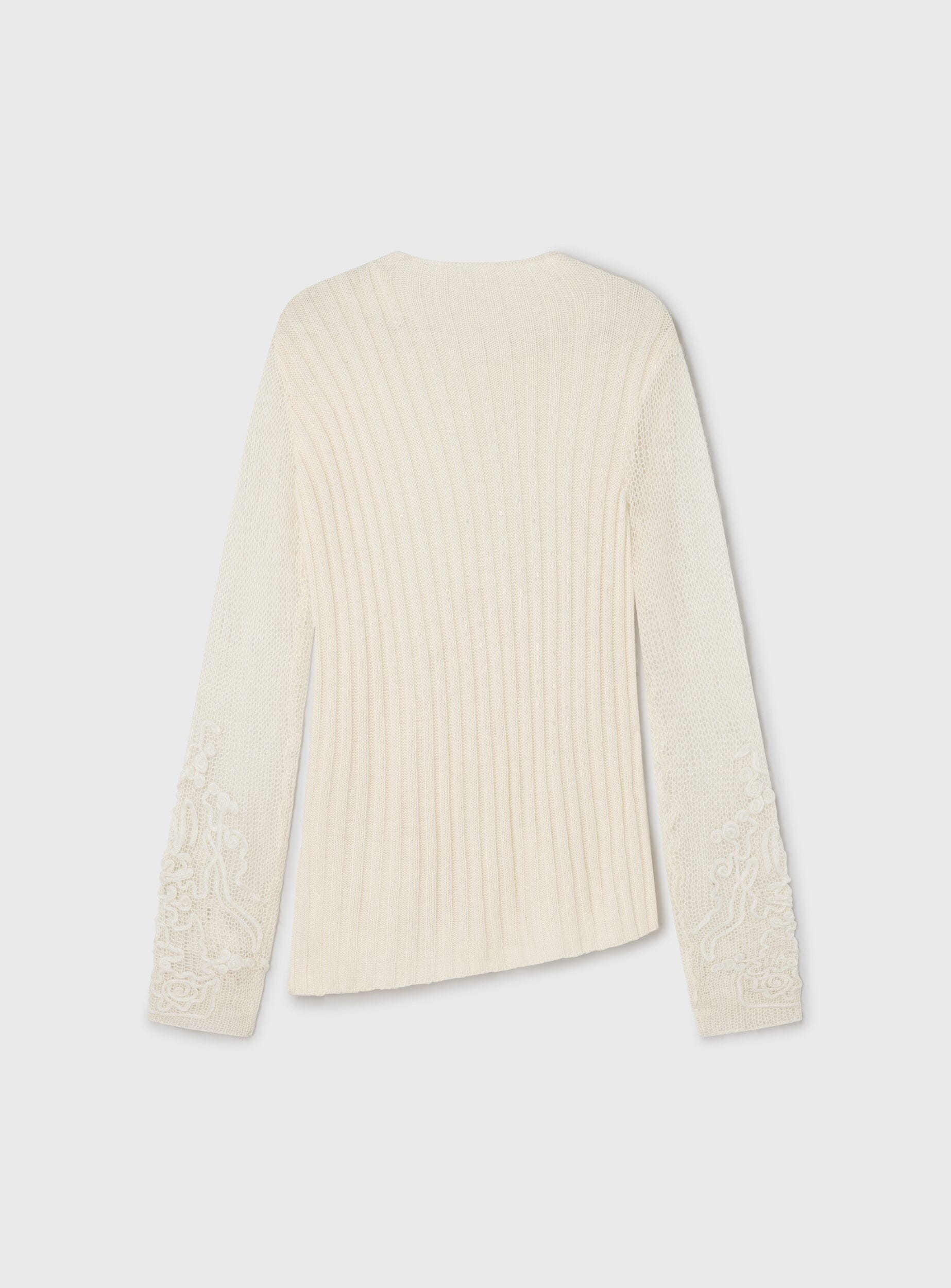 Long-sleeve textured knit top with a round neckline and fluid silhouette. Featuring decorative knit patterns across the front and cuffs and contrast ribbed knit texture at the back. Asymmetrical hemline and an adjustable knit tie at the waist.