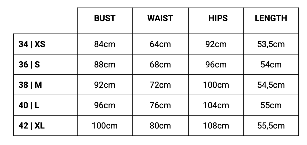 | EU SIZE | XXS | XS | S | M | L | XL |