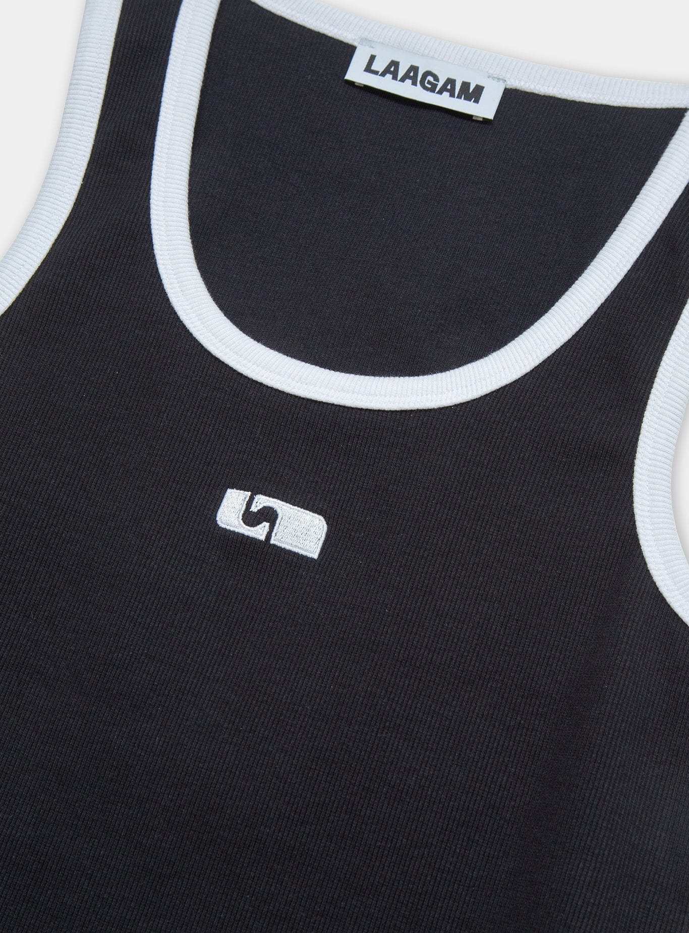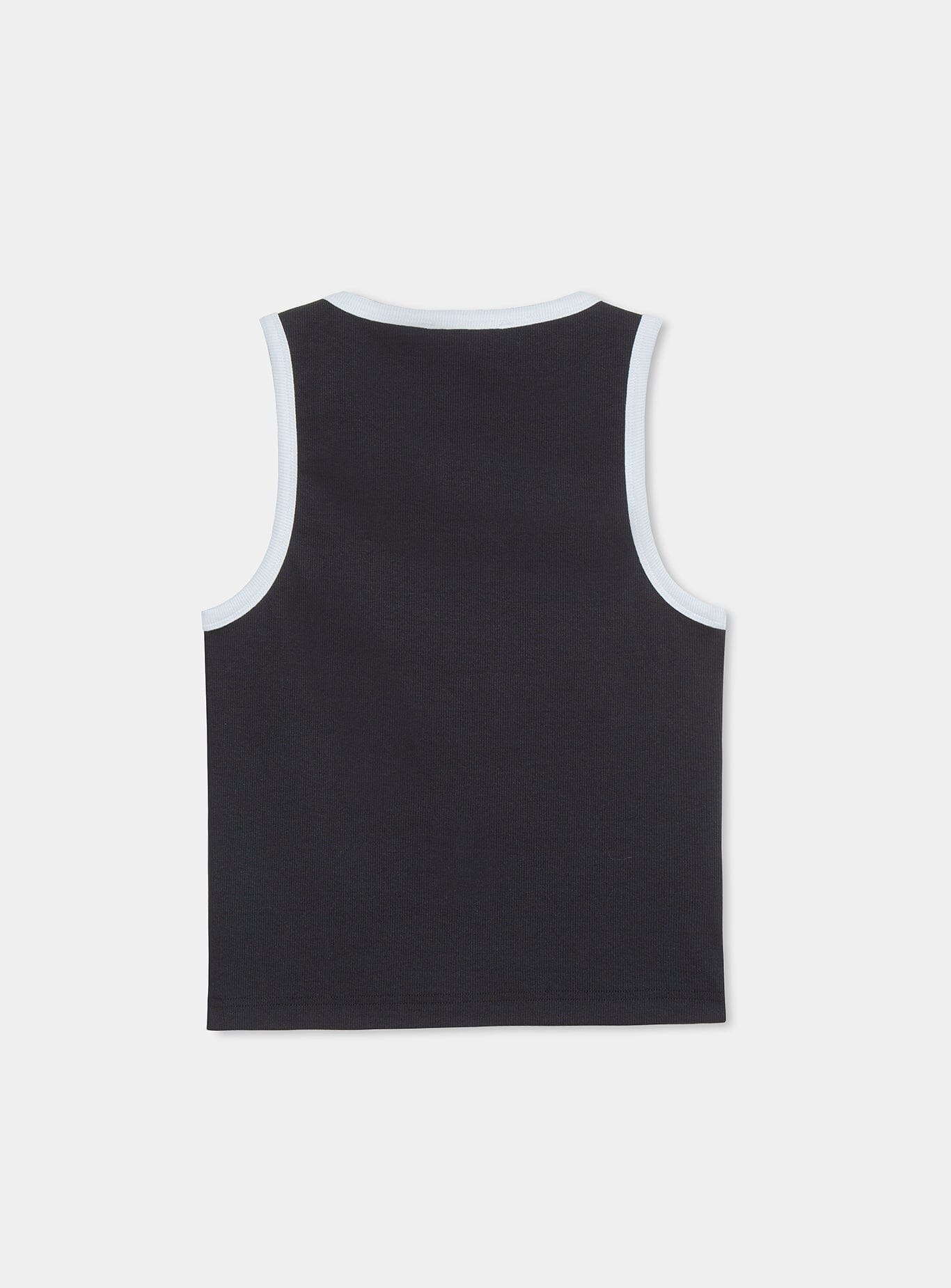 Black tank top made of light ribbed cotton. White contrast rib on neckline and armholes. Fitted, sleeveless design, with a round neckline and embroidered logo on the front. Tight. Normal length.