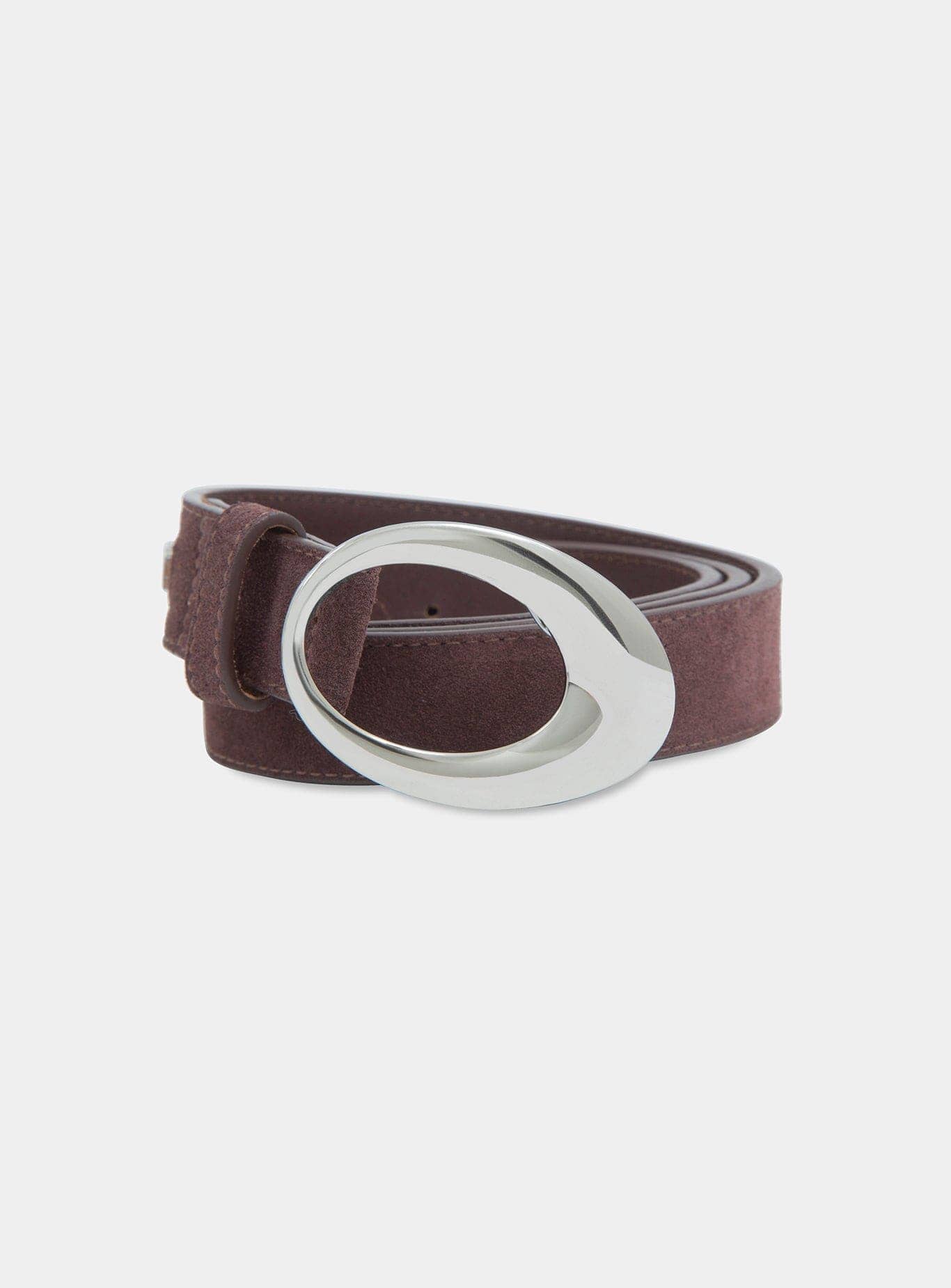 Adjustable real suede belt with oval buckle and silver metal studs details. Metal imagotype detail.