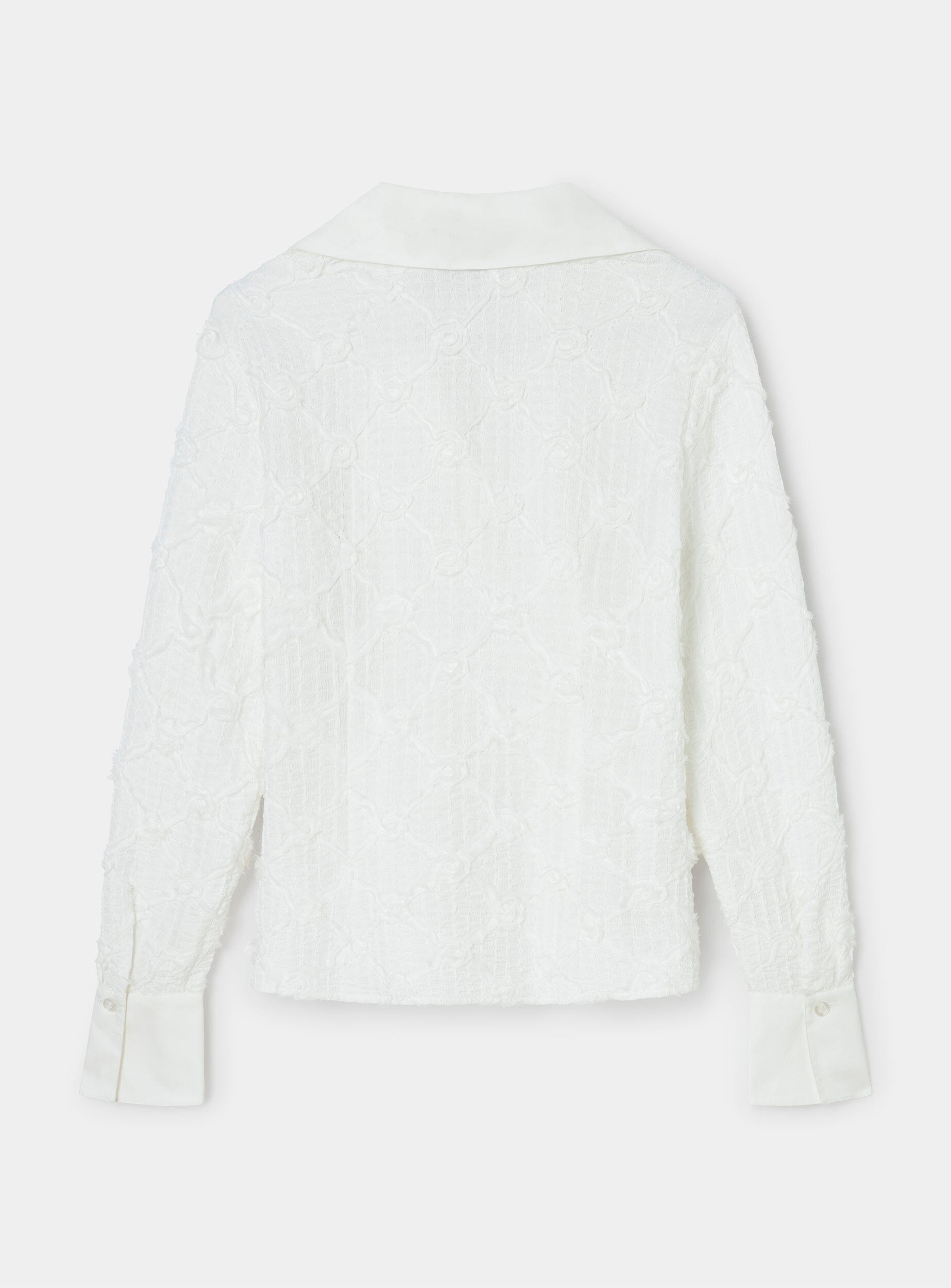 Long sleeve textured blouse. Button-up closure. Collar, front placket and cuffs in plain fabric in contrast.