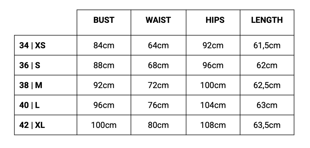 | EU SIZE | XXS | XS | S | M | L | XL |