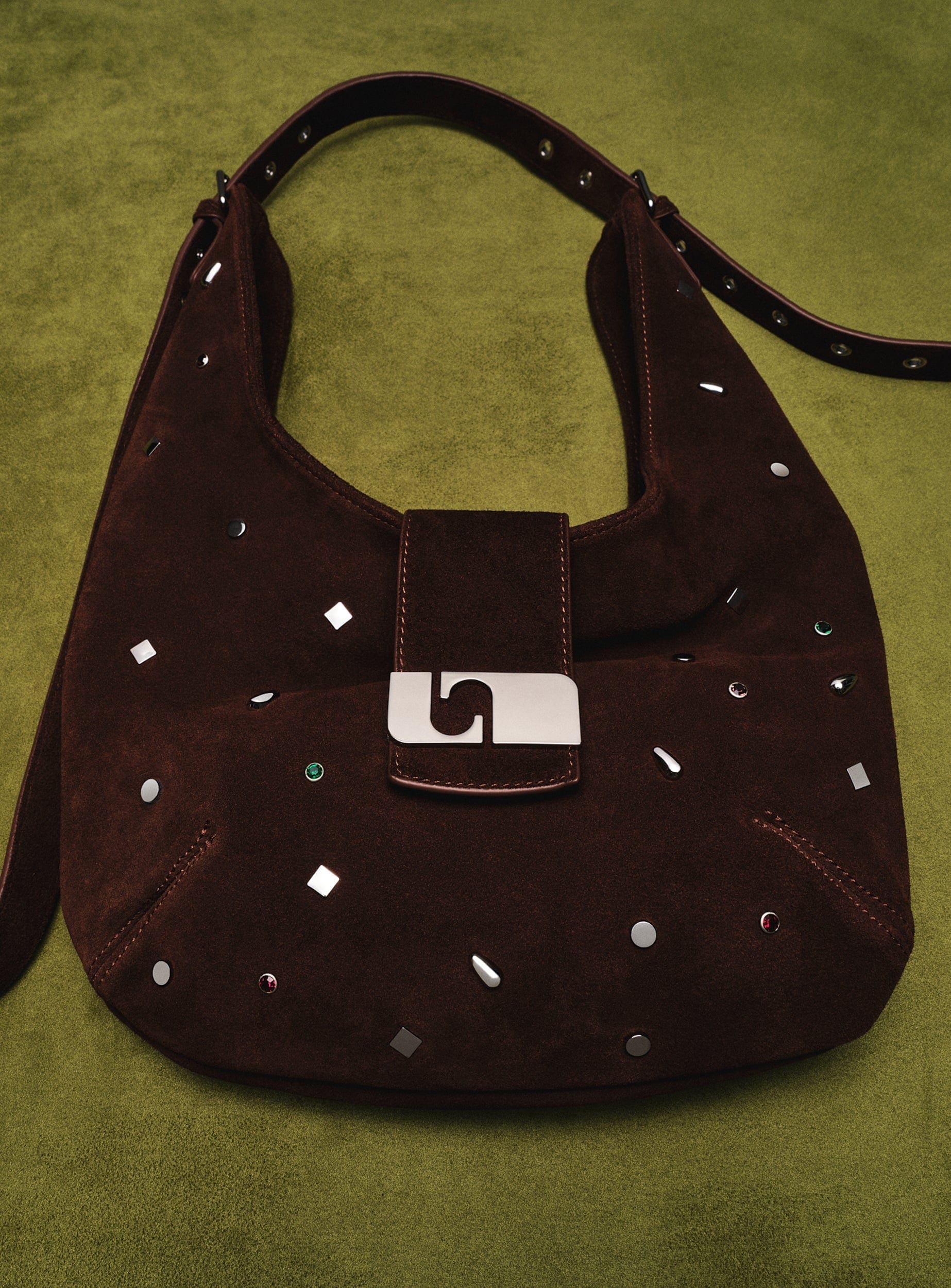 Real suede bag with metal logo imagotype closure on front and color metal details. Adjustable shoulder strap with metal eyelets. Magnetic closure and interior zipper pocket.