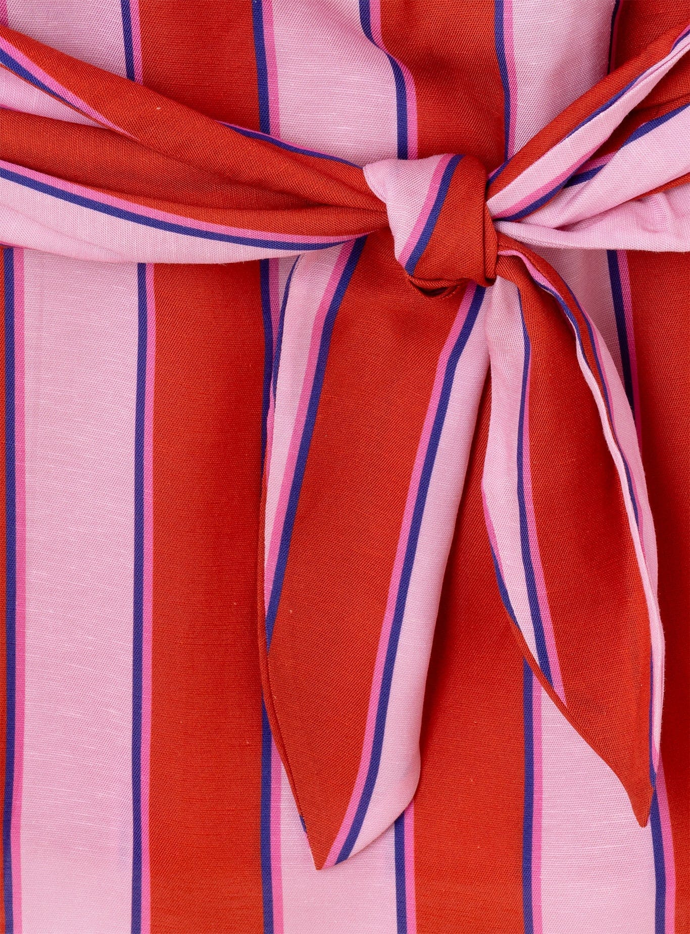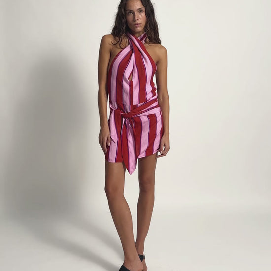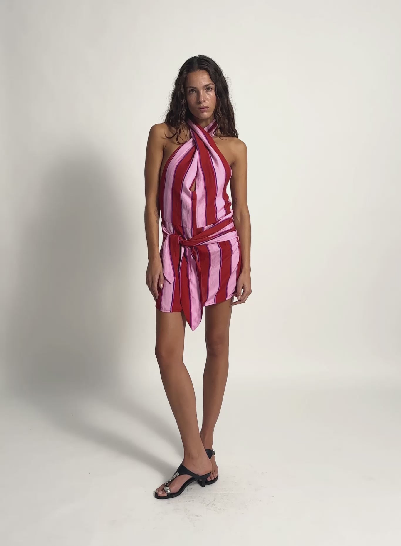 Vestido corto estampado con escote halter cruzado. Espalda descubierta. Nudo delantero y cintura elástica en la espalda.