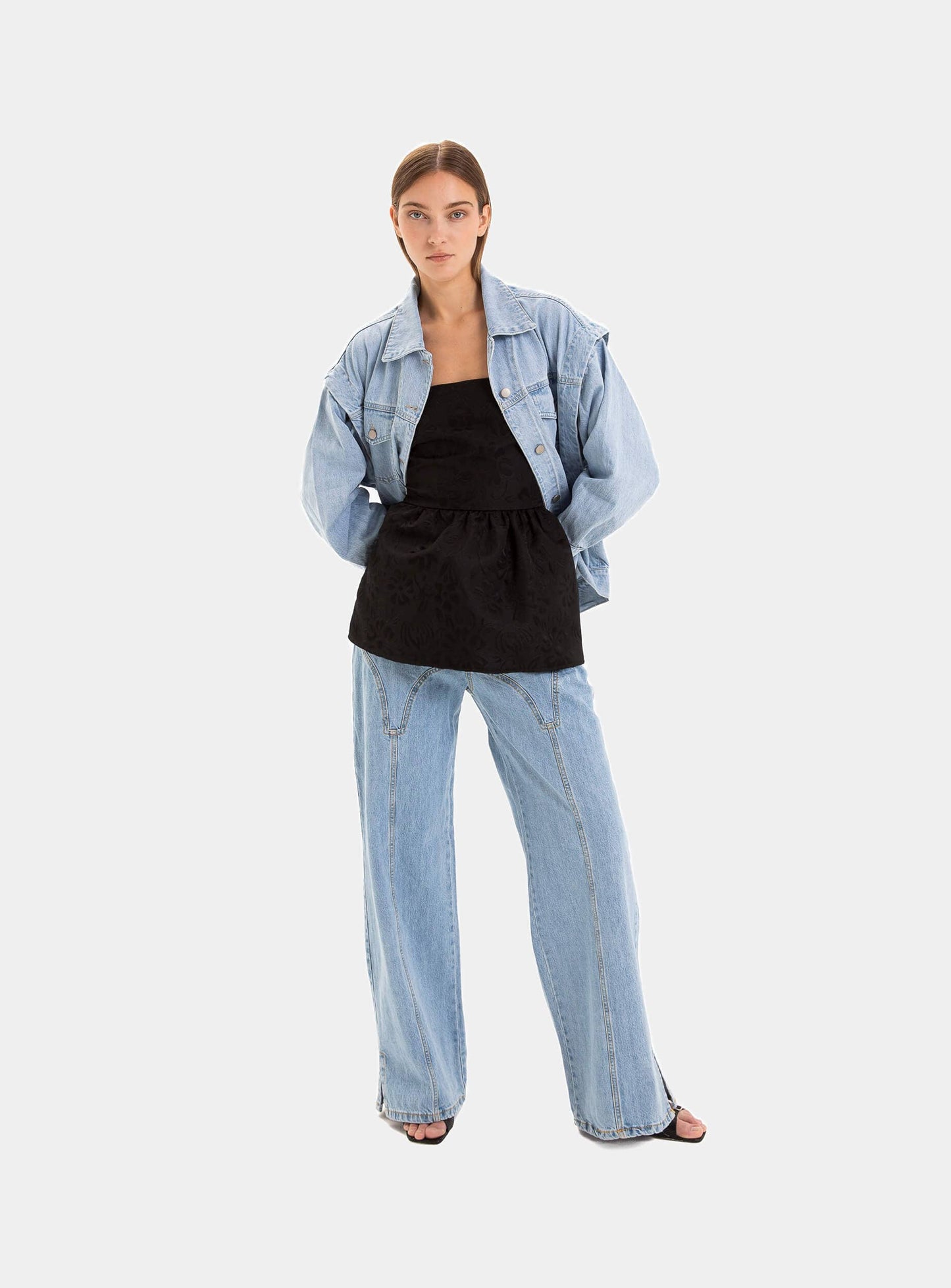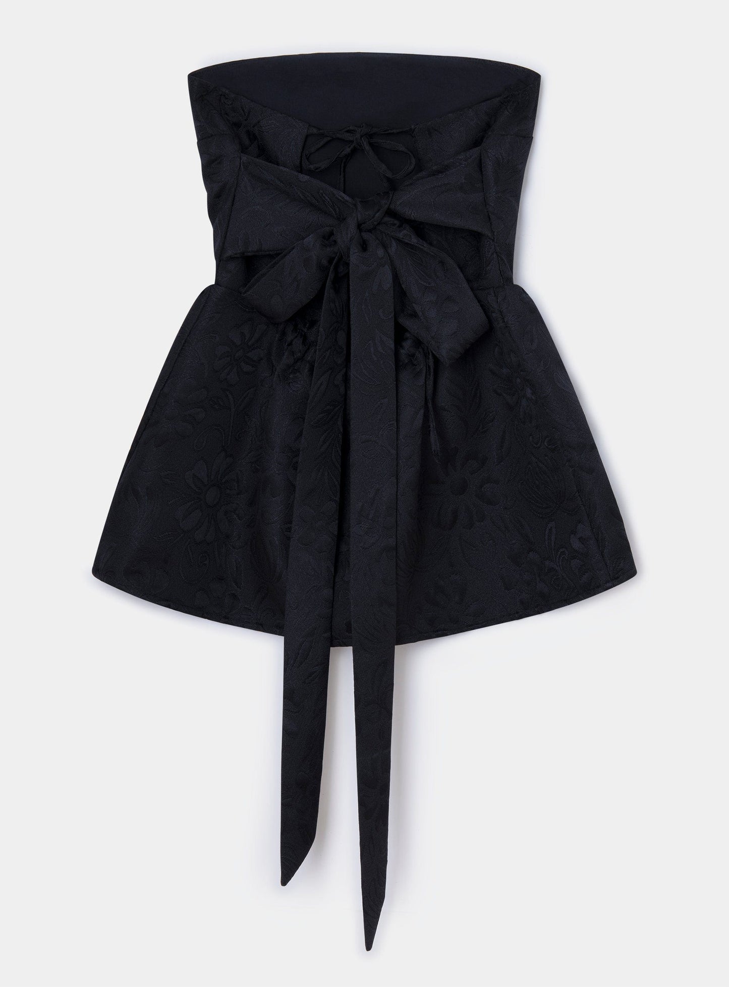 Top textura jacquard palabra de honor. Detalle de plisados en la cintura. Con una tira ancha que se ata alrededor de la cintura. Espalda abierta que se ata con dos correas traseras ajustables.