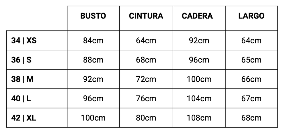 | Ancho del pecho | Ancho de cintura | Ancho de cadera | Longitud del cuerpo | Longitud de la manga | Ancho de manga | Ancho del puño | |