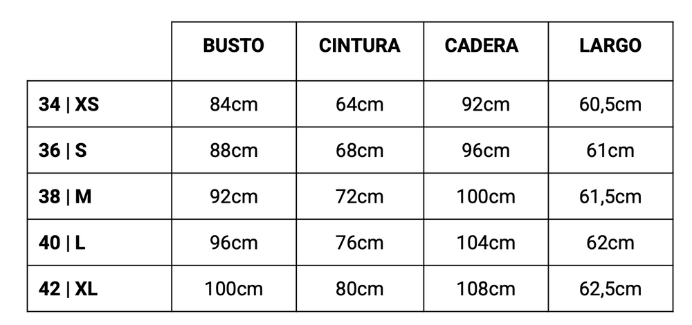 | Ancho del pecho | Ancho del dobladillo | Longitud del cuerpo | Ancho de hombros | Longitud de la manga | Ancho del puño | |