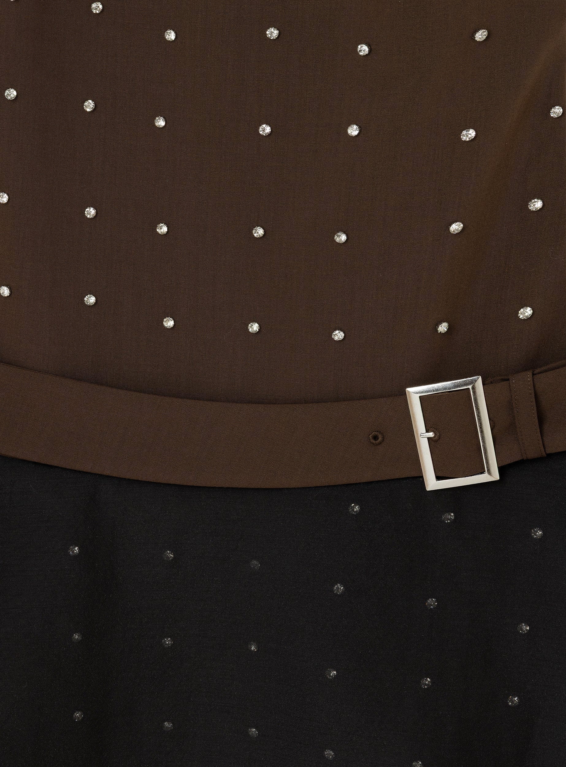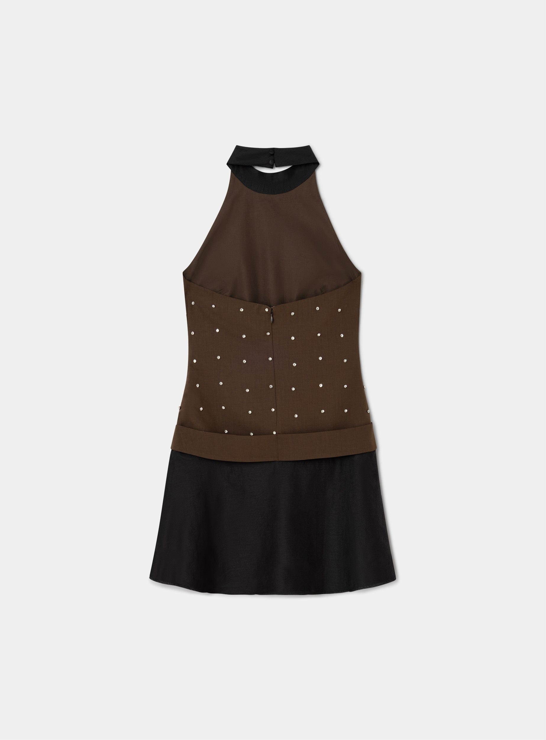 Vestido corto con escote halter y espalda descubierta, confeccionado en tejido con incrustaciones de pedrería. Diseñado con cintura marcada y un cinturón decorativo con hebilla en la cadera. La falda presenta una sobrecapa de organza en contraste. Cierre invisible en la espalda con cremallera.