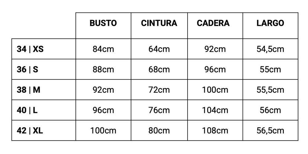 | Ancho del pecho | Ancho del dobladillo | Longitud del cuerpo | Ancho de manga | Longitud de la manga | Ancho del puño | |