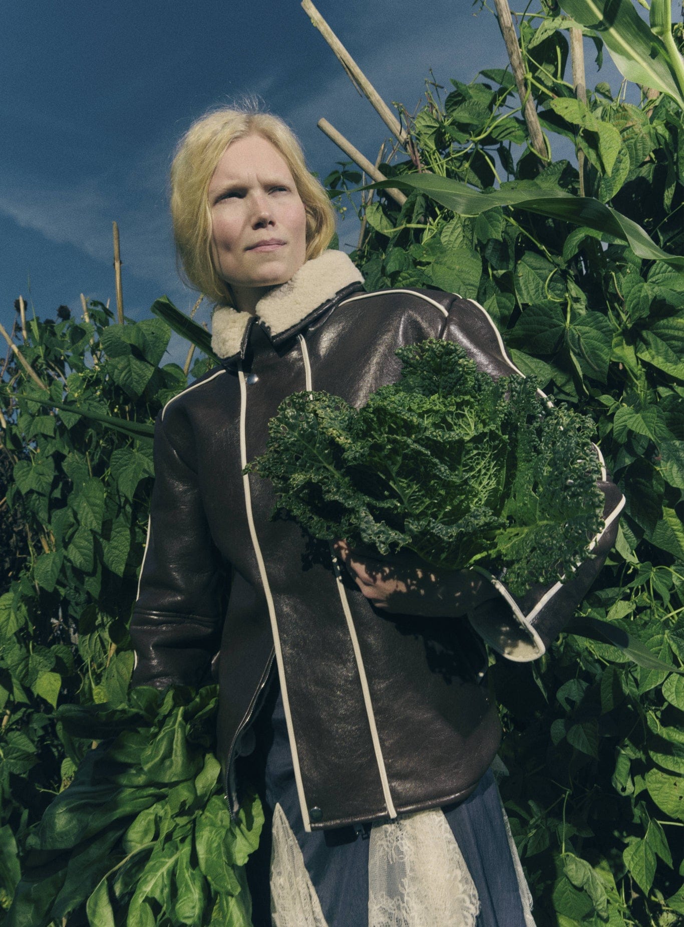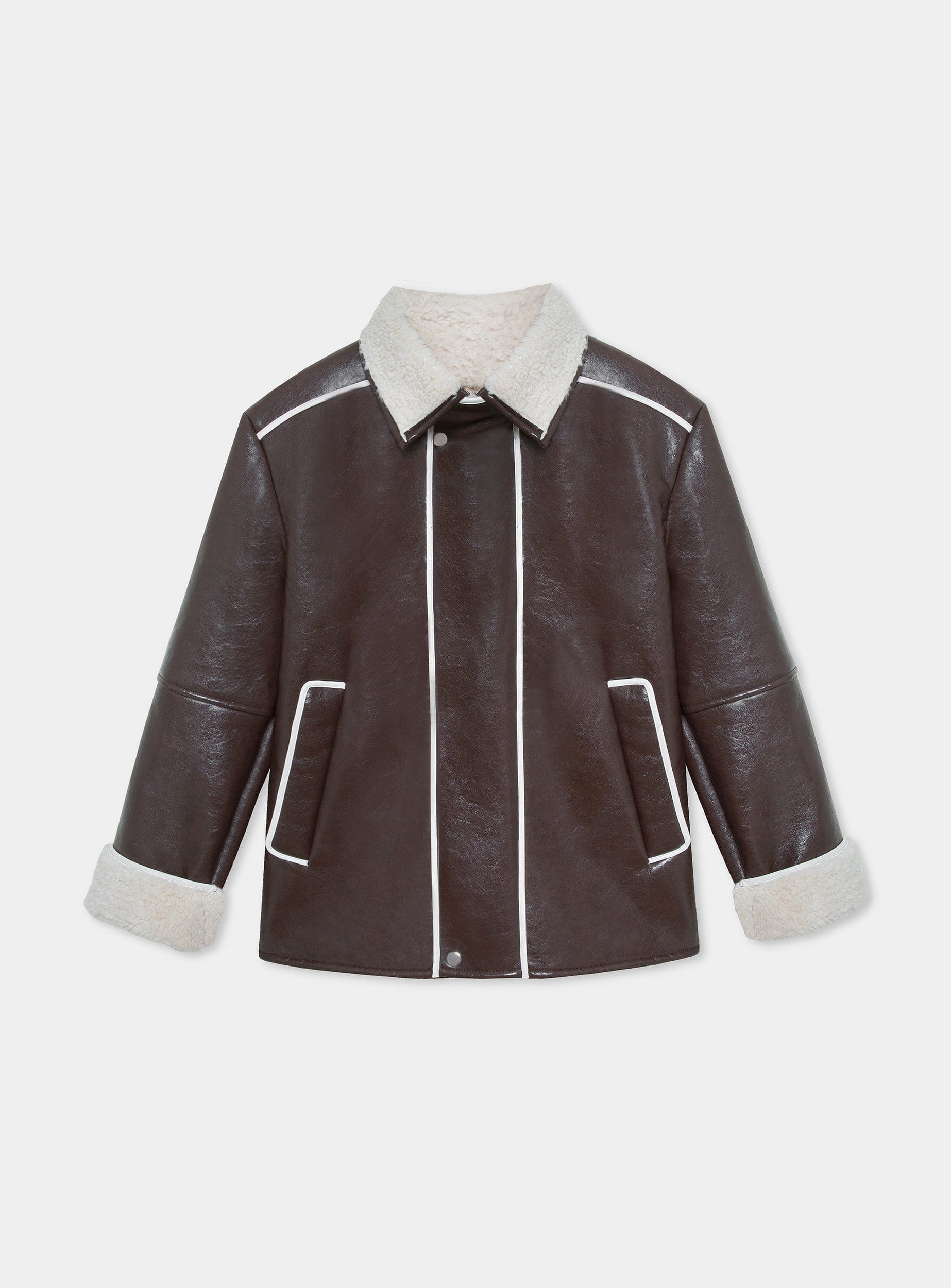 Esta chaqueta presenta una silueta ajustada confeccionada con un exterior de piel sintética marrón y un interior de borrego. El cierre frontal cuenta con una cremallera plateada metálica oculta y una solapa protectora con broches a presión. Tiene dos bolsillos delanteros, costuras con pespuntes en la espalda y cuello alto doble. Detalles de ribetes de piel sintética blanca en contraste.