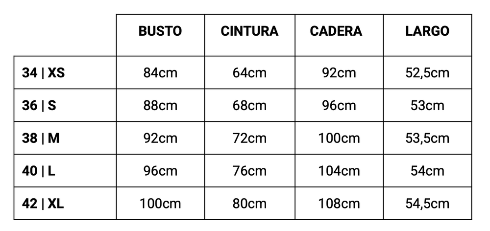 | Ancho del pecho | Ancho del dobladillo | Longitud del cuerpo | Ancho de hombros | Longitud de la manga | Ancho del puño | |