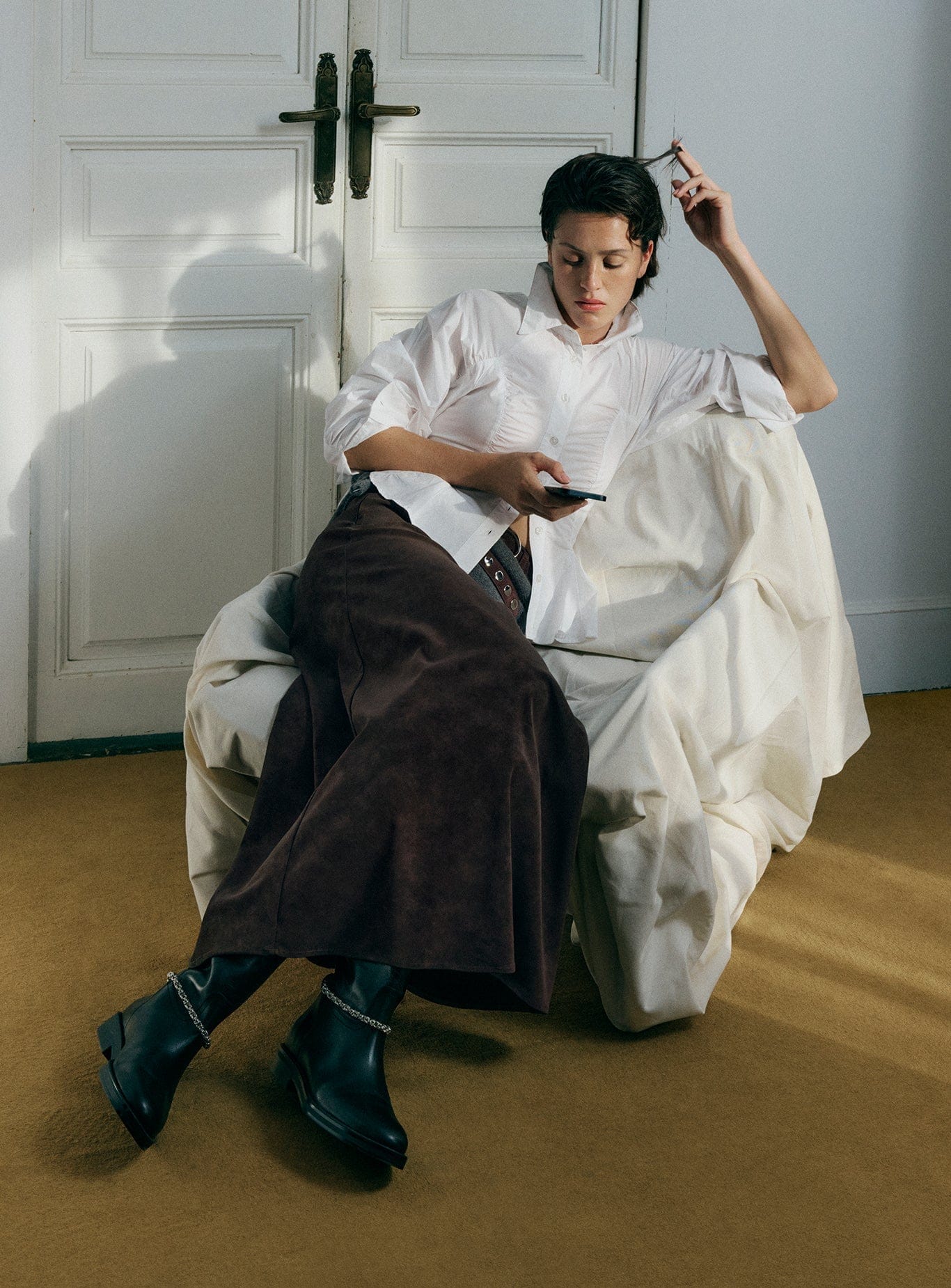 Falda marrón de corte A, de cintura alta y largo hasta los tobillos. Presenta una costura frontal asimétrica con pliegues y bolsillos insertados con solapa. La cinturilla tiene trabillas en zigzag en contraste y se cierra con cremallera invisible en el lateral.