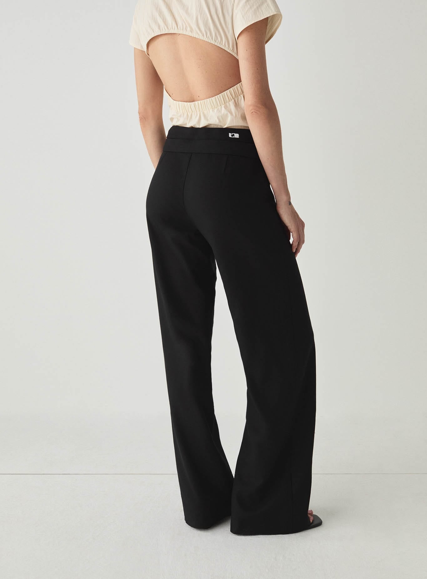 Long linen pants with a straight-leg cut and fluid drape. Double asymmetric waistband with side button closure and front zip fly. A sharper black base that anchors both tailored and relaxed looks.