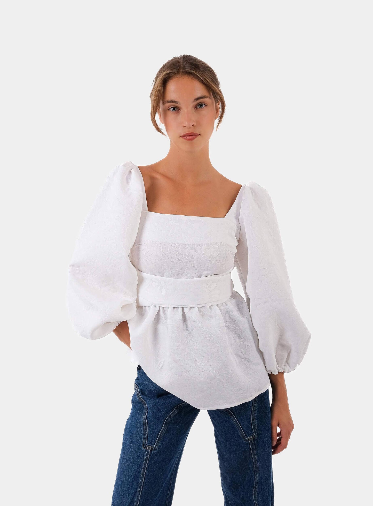 Jacquard texture blouse with balloon sleeves. Pleated detail on the waist. Featuring one wide strap that ties around the waist. Open back that ties with two adjustable back straps.