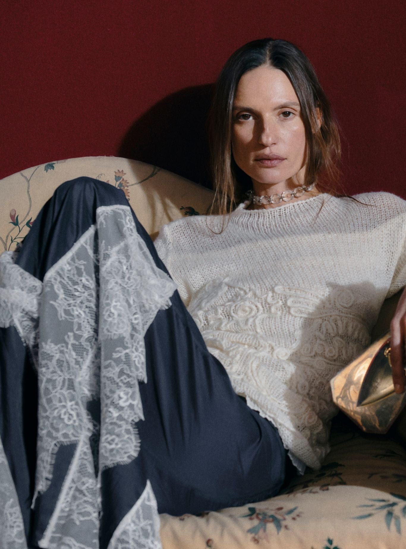 Long flared skirt with front and back slit inserts finished with contrasting lace ruffles. Side invisible zip closure. Fully lined in black.