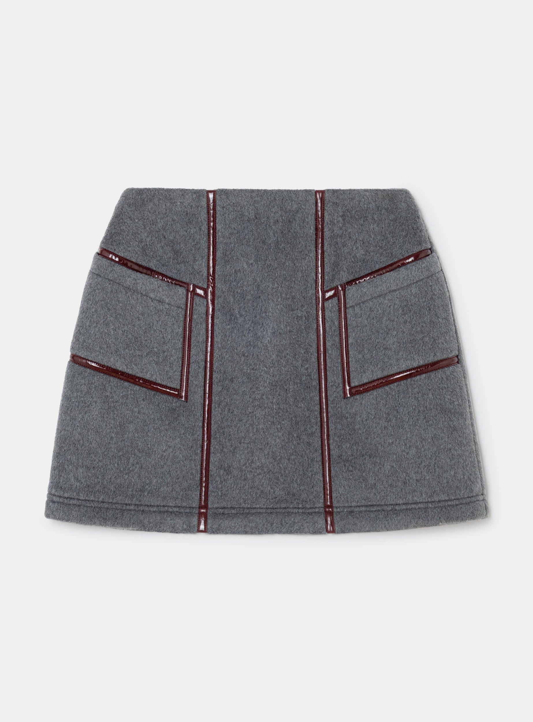 High-waist cloth short skirt with contrast faux leather piping details on seams. Two front invisible pockets. Invisible back zip fastening. Black lining.