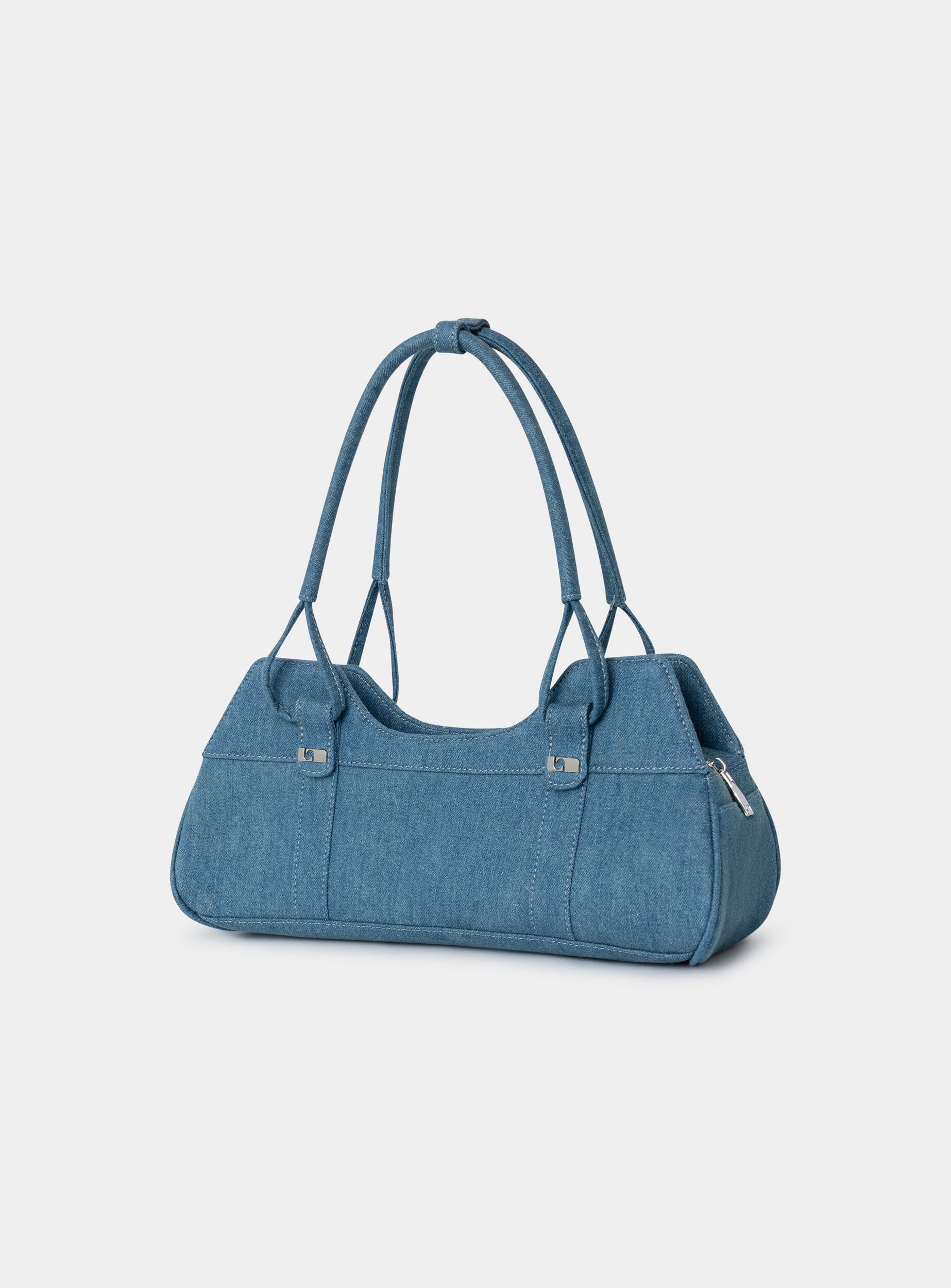 Shoulder bowling bag in soft denim, with gently rounded shape and double handles for easy carry. Casual structure with a textured, durable finish