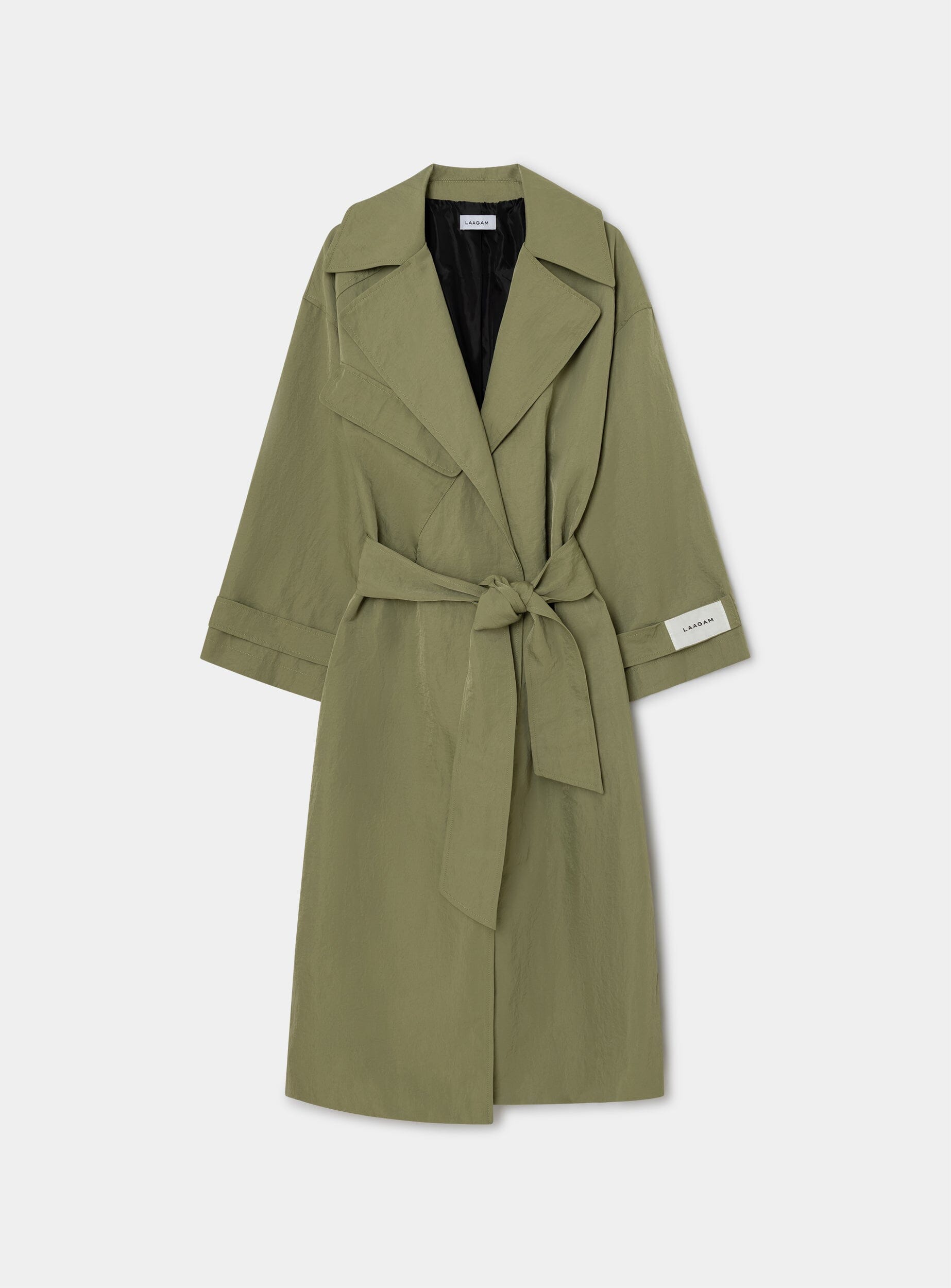 Oversize trench coat with lapel collar and long sleeves. Two invisible side pockets. Adjustable self-belt in the same material. Vent at back hem. Black lining.