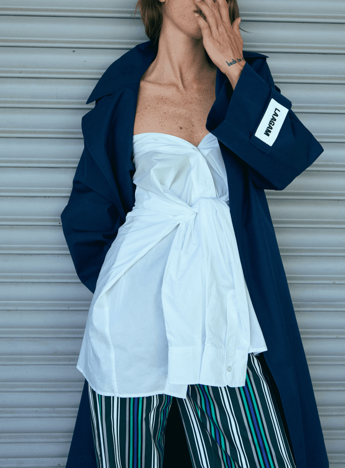 Oversized trench coat with lapel collar and long sleeves. Two invisible side pockets. Adjustable self-belt in the same material. Vent at back hem. Black lining. Waterproof.