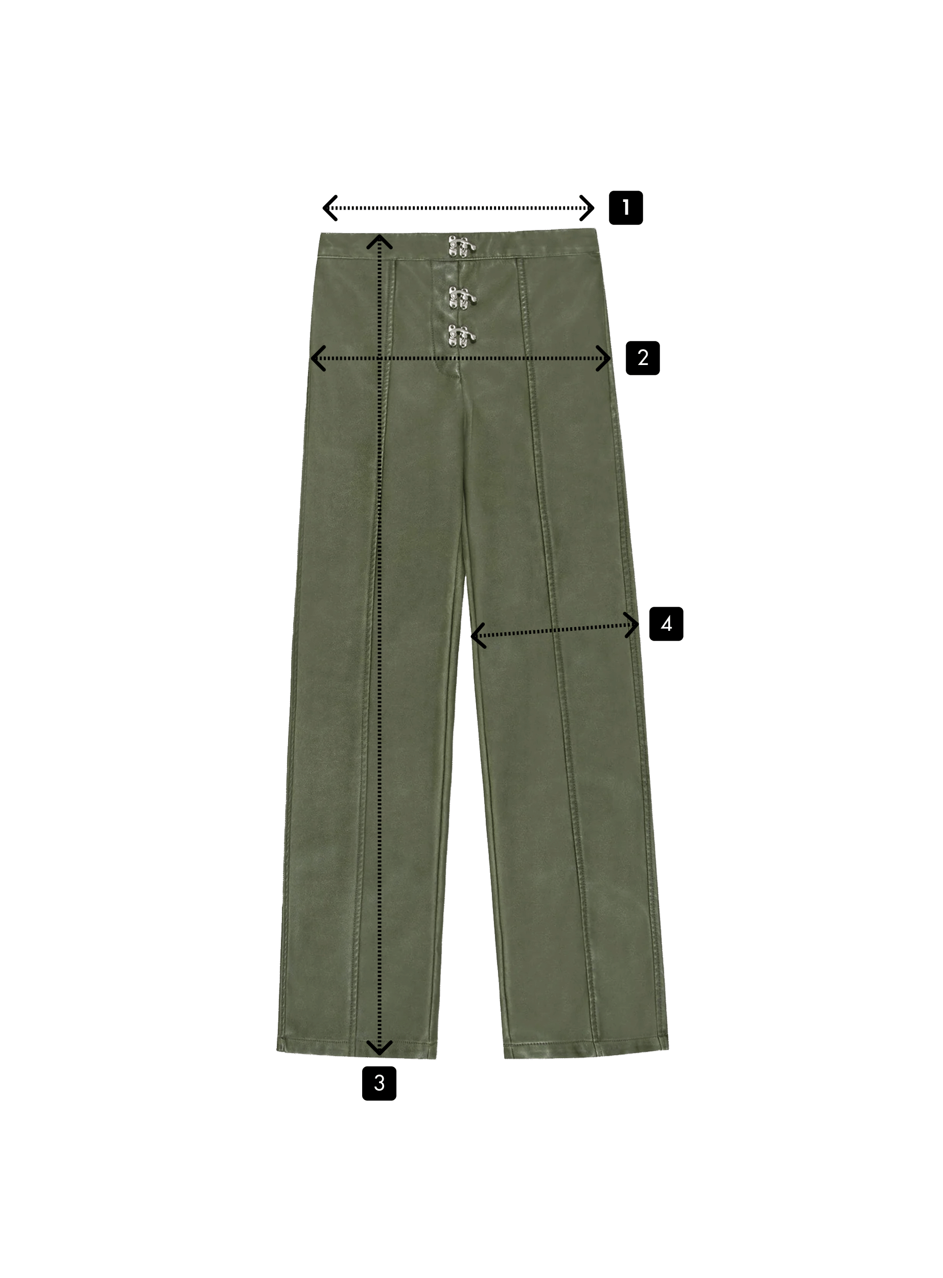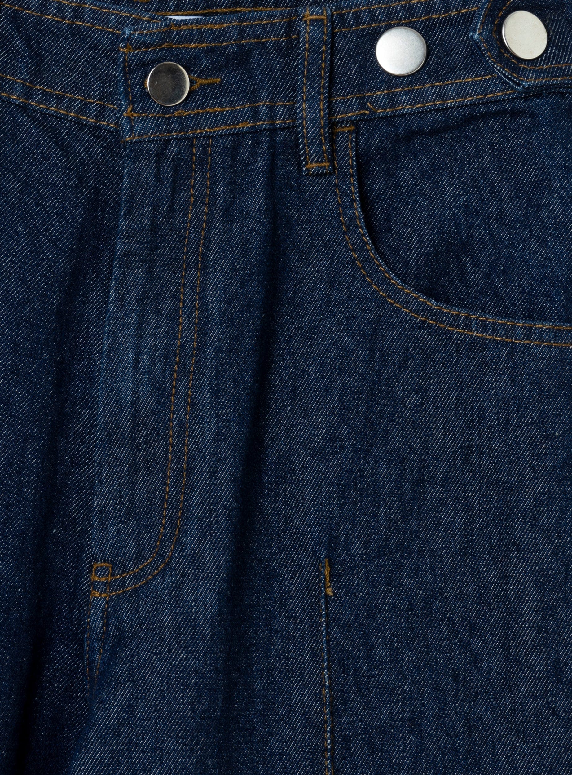 High-waist denim jeans with wide leg silhouette. Waistband with belt loops, strips and big round buttons in metallic silver. Front zip and metal button closure and pockets on back.