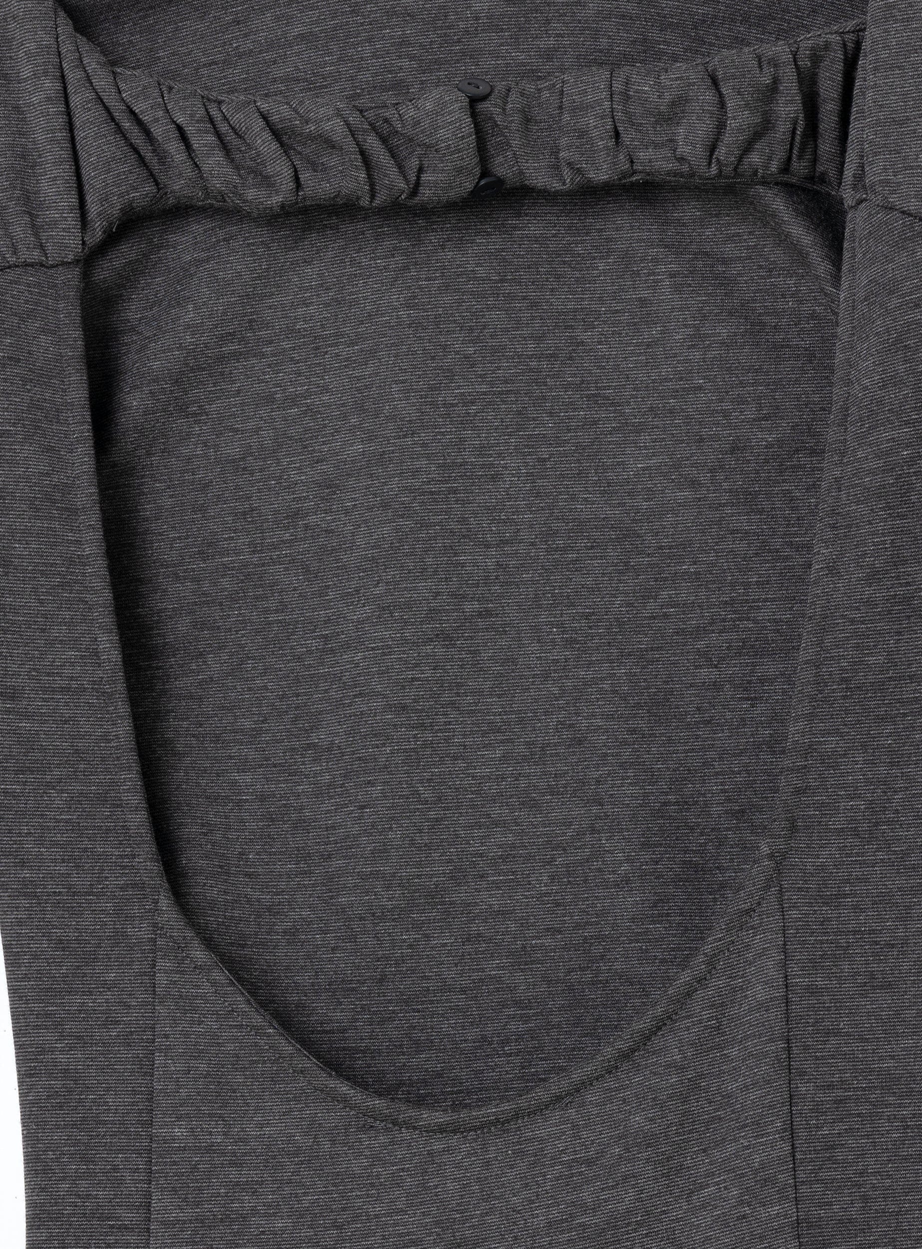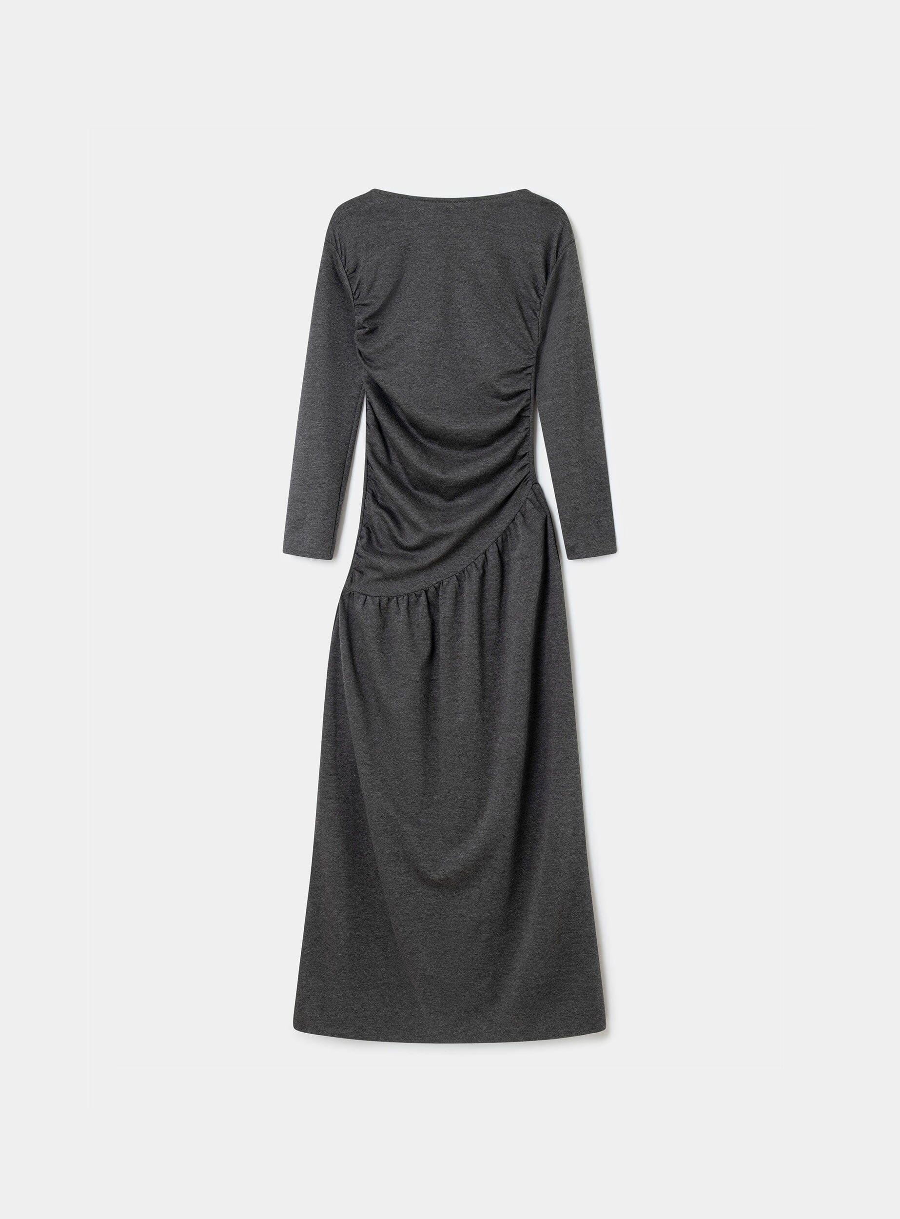 Midi long sleeve stretch dress with fitted silhouette. Rounded wide neckline and low shoulder. Dreaped bodice on front with diagonal seam from waist to hip. Flared midi length skirt with plets from waist. Open back with button closure under neck. Yoke draped piece on top.