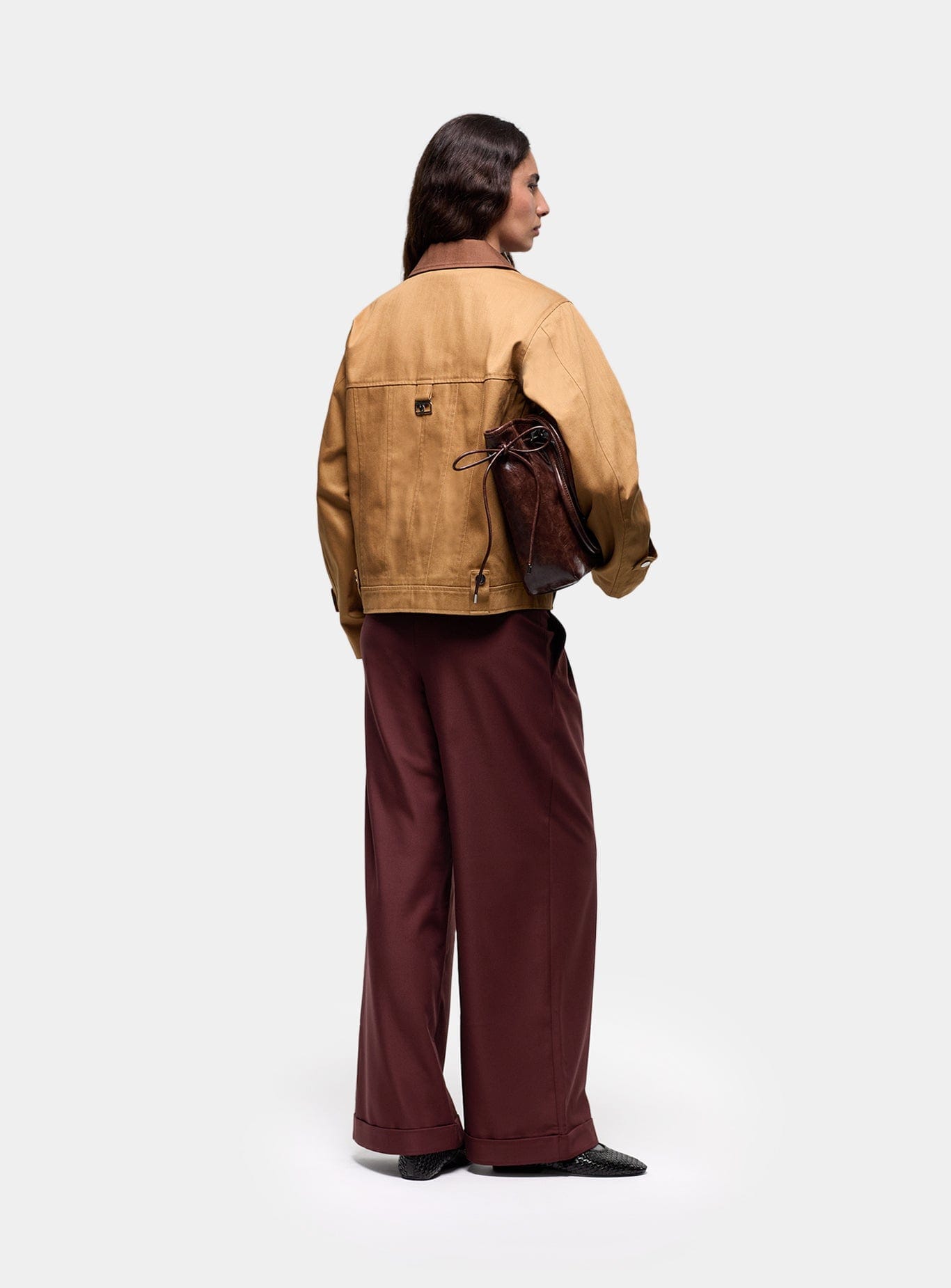 This structured jacket features a darker collar in the same fabric and a front crossed placket with metal snap buttons and two decorative loops at the middle. Front with inclined plackets on chest and lateral front pockets. Wide bottom piece with loops. Back with yoke and a loop with a metallic imagotype and seams with stitchings on the bottom part. Long sleeves with adjustable cuff tabs. Black lining.